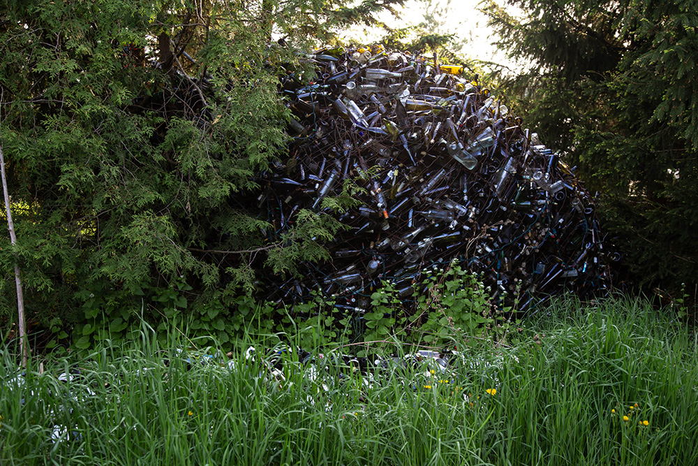 It’s 10:00pm and a group of us are still hanging out, drinking cider by the light of a single bare bulb emanating from the barn. Stadtländer emerges from the house, “So will you be staying over for the night?” We have options; The trailer near the pond or camping out anywhere on his acreages made up of farm field, forest, and larger than life mixed-media sculptures. It’s tempting, but it’s already dark and tomorrow’s Monday. As we make our way down the gravel driveway, crickets chirping loudly, we pass a giant, 20ft-wide and 10ft-tall, bursting with empty wine bottles; A scene straight out of a seaside fantasy; And one more striking, yet friendly, reminder of our consumption as we wave goodbye.