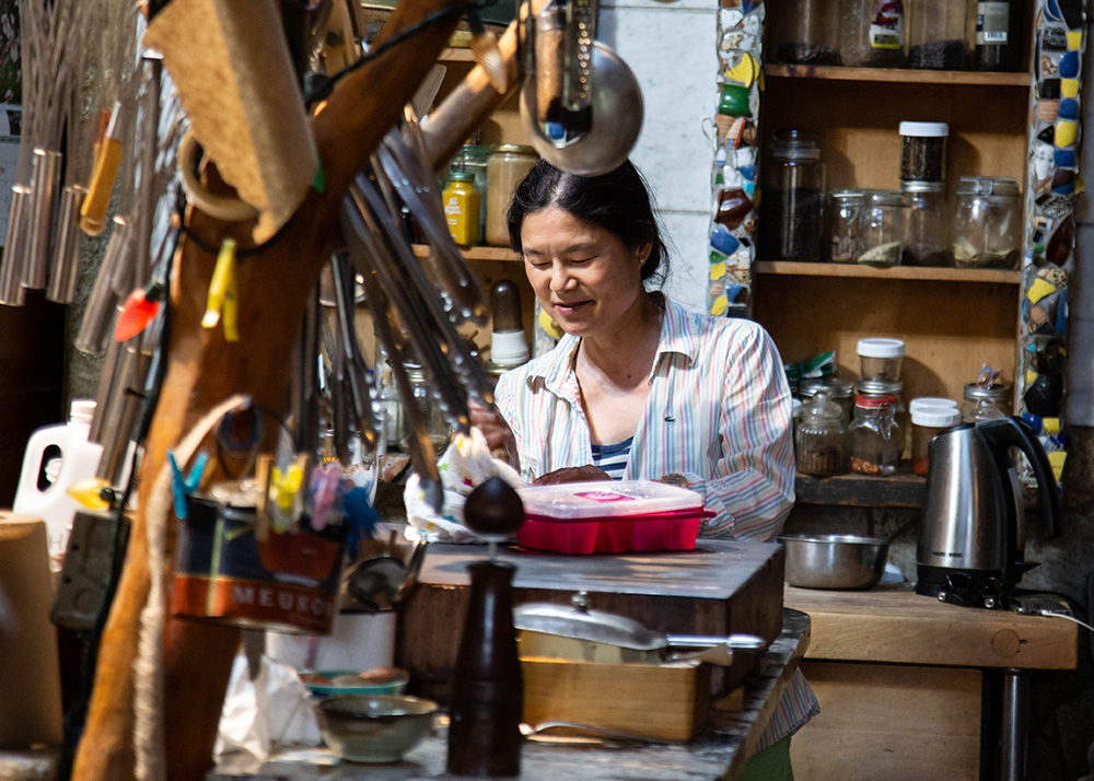 Once the event ends and guests trickle out, Nobuyo’s Japanese-inspired meal is the ultimate comfort food for the chefs. She’ll push a bowl of deliciously sea salty soba noodles forward as she glides around the cutlery tree center-piece of her own kitchen in a flurry of smiling energy. Does she need coffee? I’m thinking maybe not.