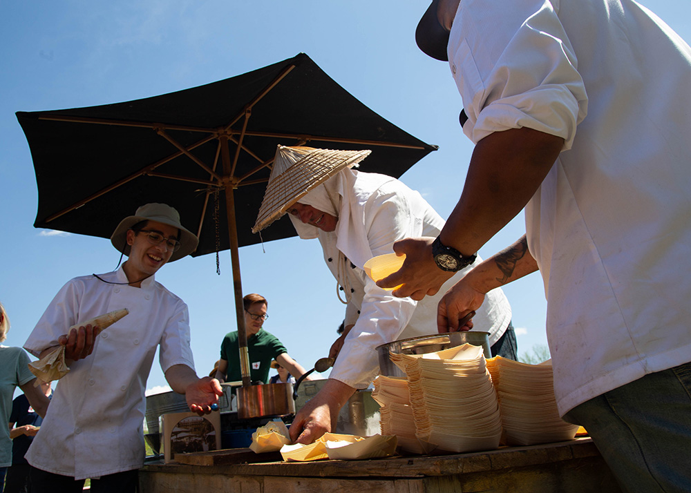 His face is mostly covered by an oversized, woven triangle; A traditional Asian farmers’ hat, likely an influence of his Japanese wife, Nobuyo Stadtländer. He’s serving up his own ice cream recipe, “Ontario maple syrup and wild ginger crocant with rhubarb, apple and black current compote”. Sous-chefs in training work diligently by his side and Stadtländer himself moves speedily and with purpose. It’s an unseasonal 27 degrees Celsius in this wide open farmers’ field and it IS ice cream, after all.