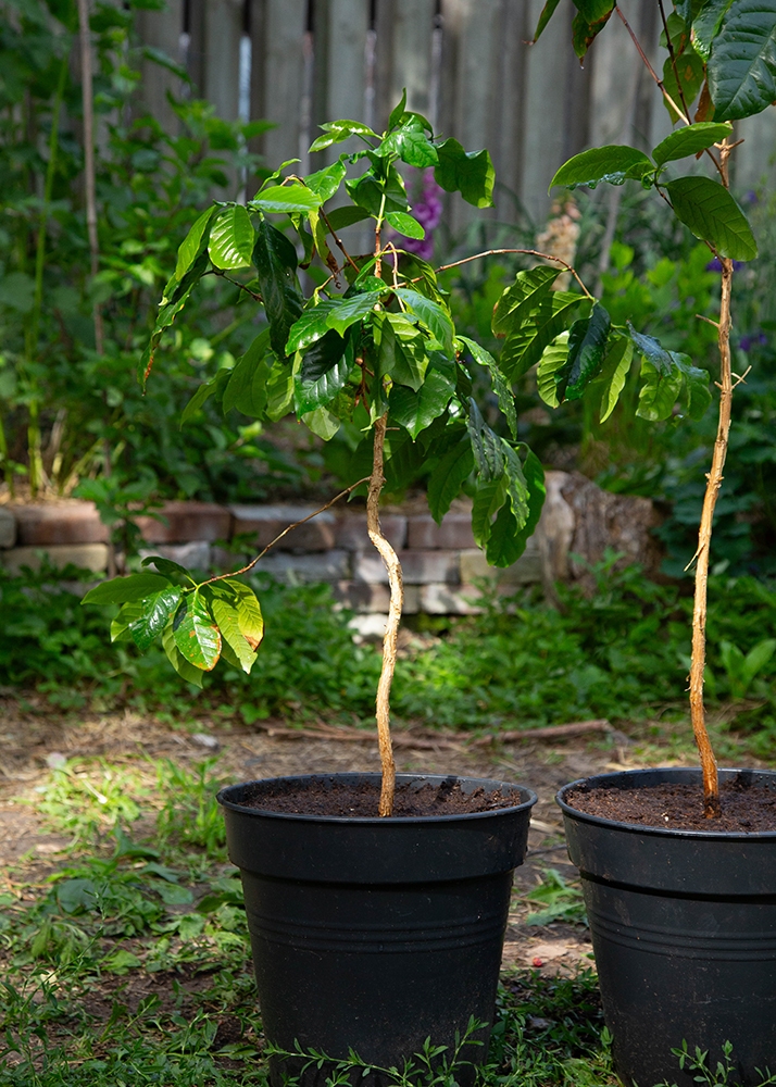 Now that they’ve been re-potted these coffee plant rescues (which were a bit neglected at a cafe) have a good chance of developing more full and healthy branches as they grow.