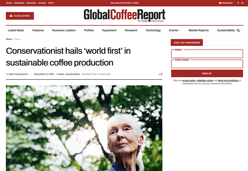 The Global Coffee Solution partners and I are beginning to drive worldwide awareness for this sustainable coffee program. This week, our Integrated Open Canopy growing method was featured in multiple print and online newspapers, spearheaded by the support of Dr. Jane Goodall and Bewley’s Coffee & Tea. This includes today’s coverage in Global Coffee Report!